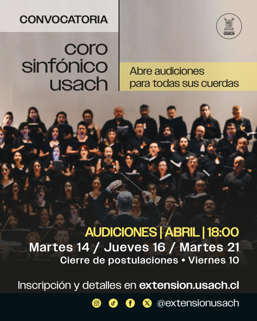 Quienes se integren al Coro Sinfónico Usach, que es dirigido por Andrés Bahamondes González, podrán participar de los conciertos que la agrupación ofrecerá durante su temporada 2026, que contempla programas propios y colaboraciones con la Orquesta Usach y el Coro Madrigalista Usach.