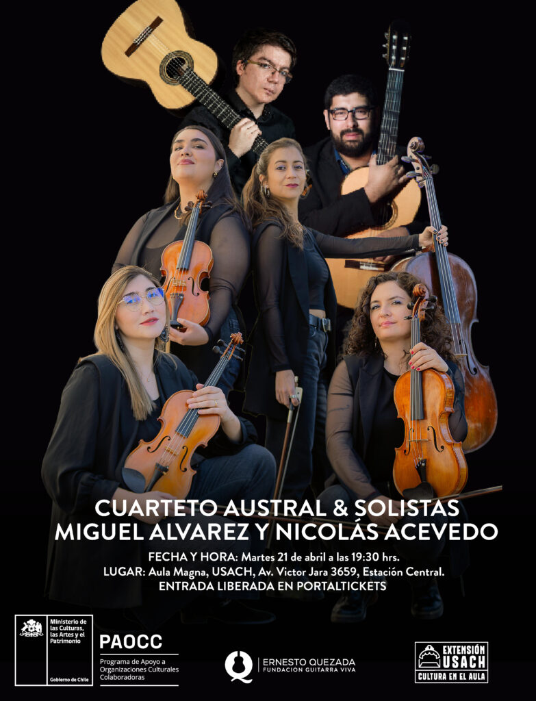 Un recorrido por la música chilena creada en la actualidad, sobre todo por mujeres, se podrá escuchar en el primer concierto que la Fundación Guitarra Viva Ernesto Quezada presentará este año en el Teatro Aula Magna Usach. Ahí compartirán escenario el Cuarteto Austral y los guitarristas Miguel Álvarez y Nicolás Acevedo.