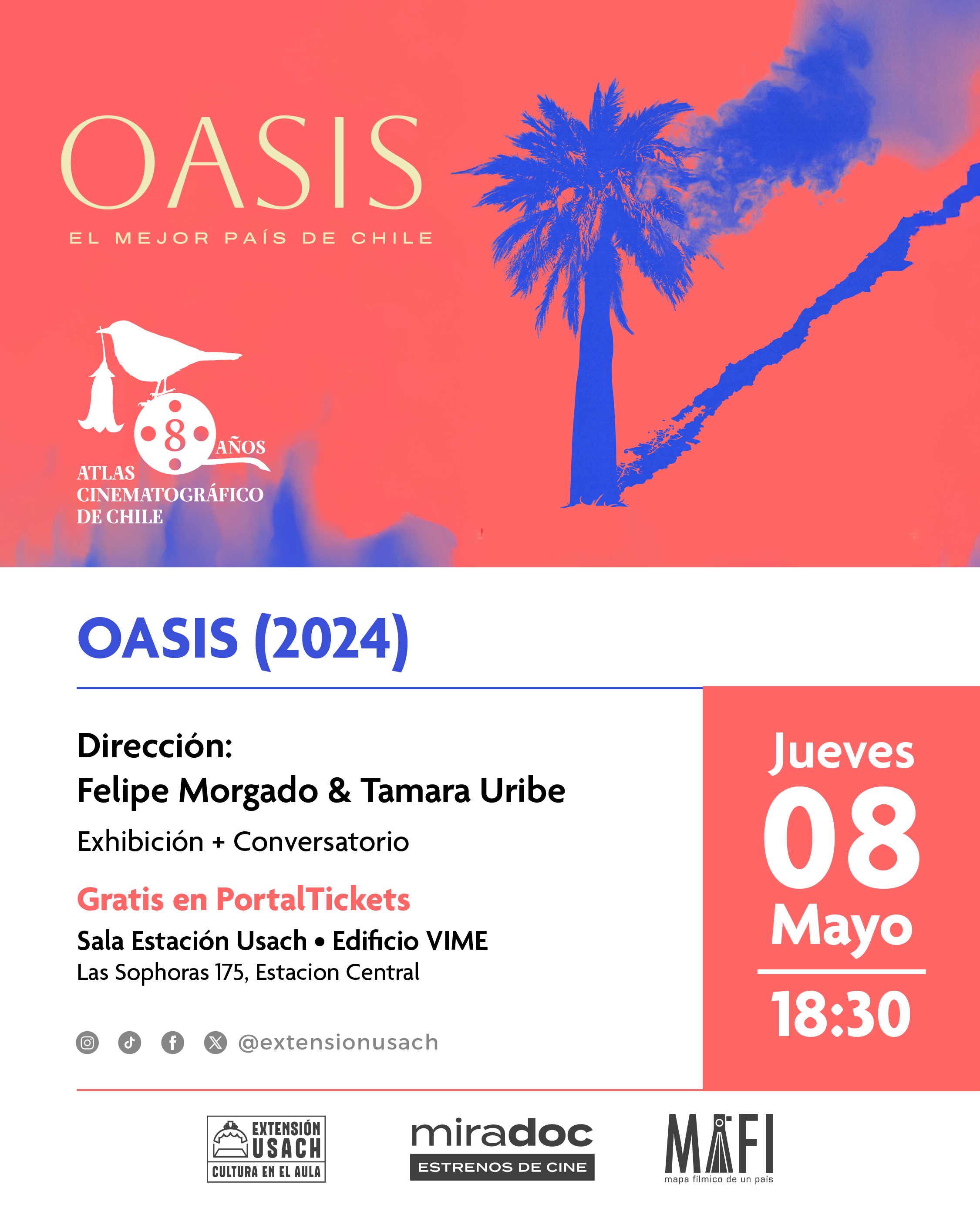 Función gratuita del ciclo Atlas Cinematográfico de Chile en Sala Estación Usach, que en esta oportunidad exhibe el largometraje documental “OASIS” del colectivo MAFI distribuido por MIRADOC. Dirigida por Tamara Uribe y Felipe Morgado, y producida por Alba Gaviraghi y Diego Pino, la película aborda el proceso constitucional vivido durante el movimiento social en Chile.