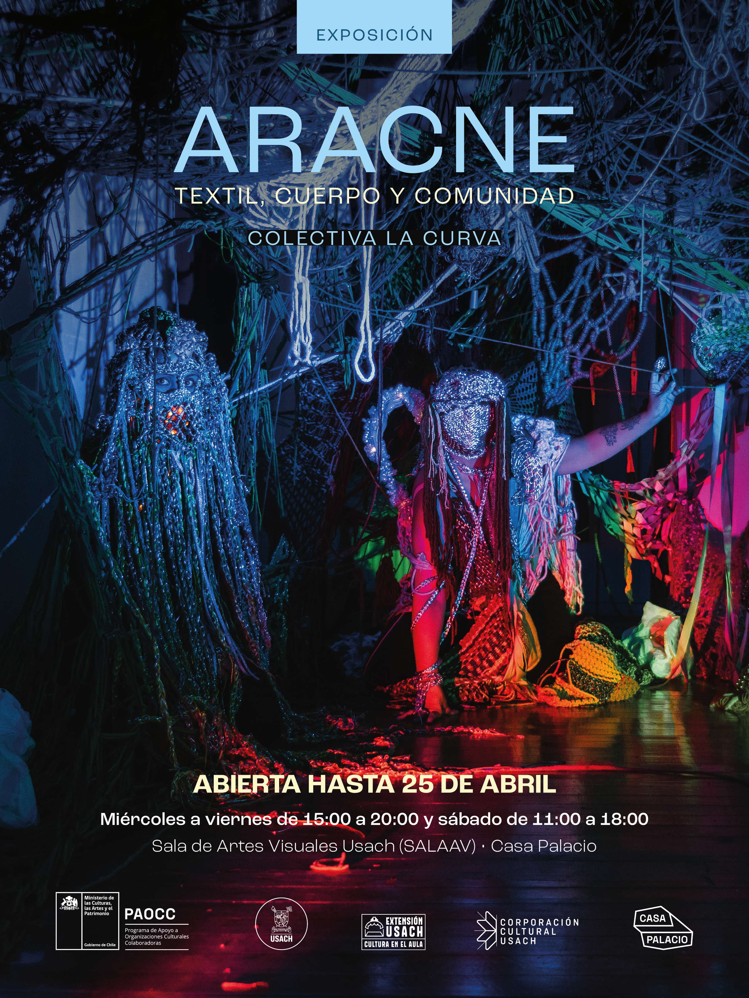La Vicerrectoría de Vinculación con el Medio a través de su Departamento de Extensión y la Corporación Cultural Usach, tienen el agrado de invitarle a la inauguración Aracne: Textil, cuerpo y comunidad, el jueves 26 de marzo a las 19:00 horas. Correspondiente a la primera muestra del año de la Sala de Artes Visuales Usach (SALAAV USACH), ubicada al interior del centro cultural en formación Casa Palacio.