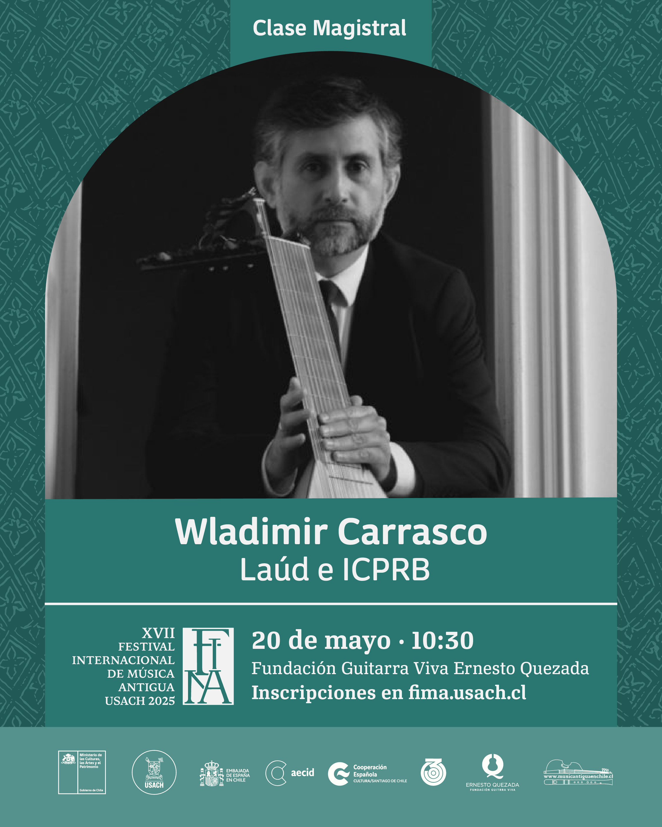 El XVII Festival Internacional de Música Antigua Usach (FIMA) presenta una clase magistral de Wladimir Carrasco, en el auditorio de la Fundación Guitarra Viva Ernesto Quezada.