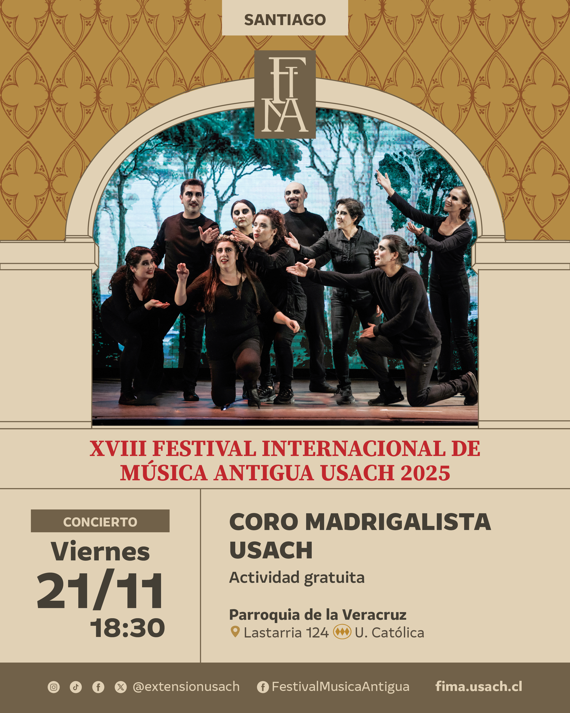 El XVIII Festival Internacional de Música Antigua Usach (FIMA) presenta un concierto del Coro Madrigalista Usach en la Parroquia de la Veracruz.