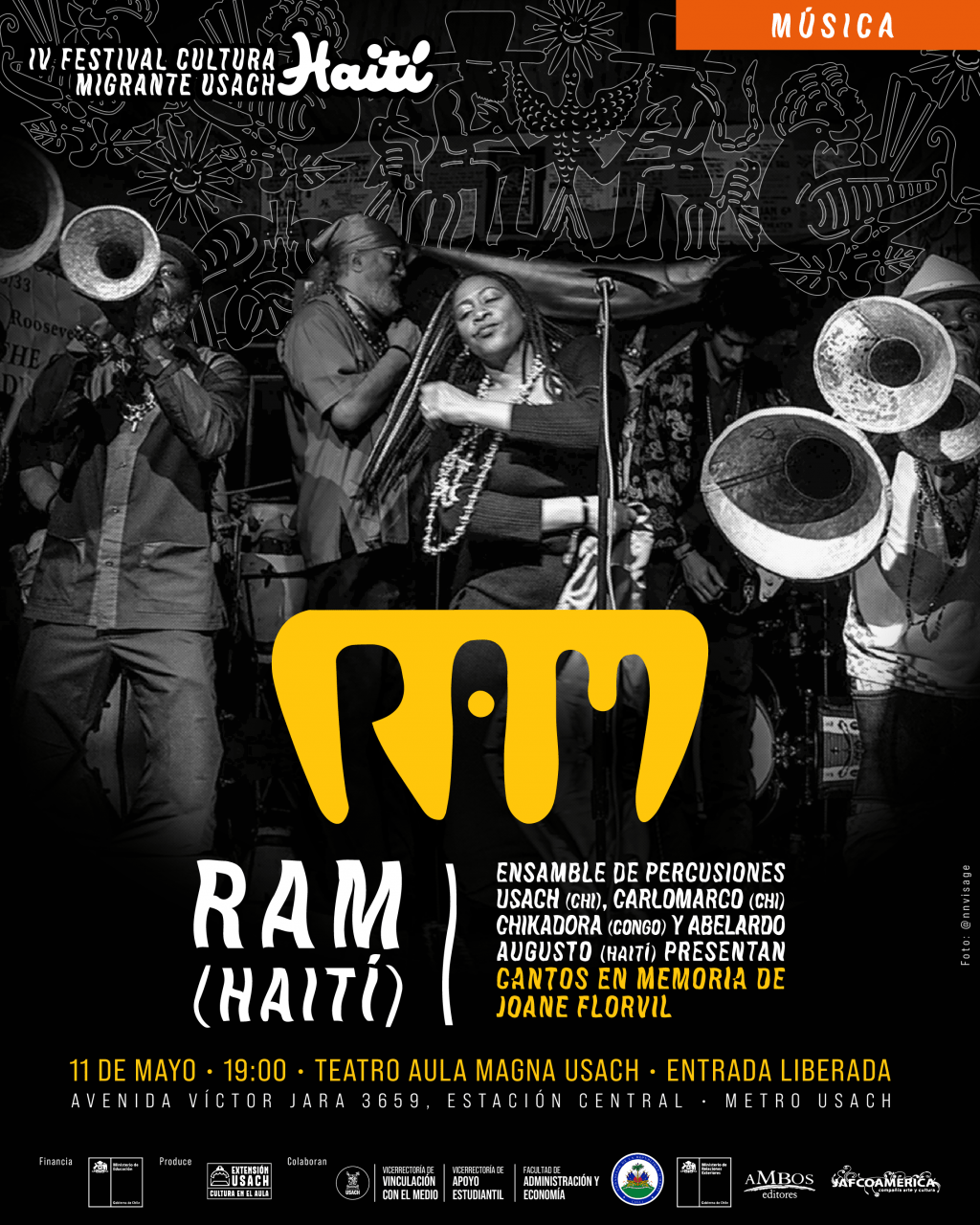 Precisamente de esta rica historia cultural, artística y patrimonial da cuenta la programación de este Festival que se desarrollará entre el 2 y el 12 de mayo en el campus único de la USACH. Entre sus principales actividades gratuitas y abiertas a todo público destacan el debut en Chile de RAM, las visitas de figuras consulares del arte y la academia haitiana como el sociólogo Jean Casimir y el cineasta Arnold Antonin, como también representantes de la comunidad haitiana residente en Chile: el escultor en hierro James St Cloux, el coreógrafo Evens Clecerma, la cantante Florie y el poeta Jean Jacques Pierre-Paul, entre otros y otras.